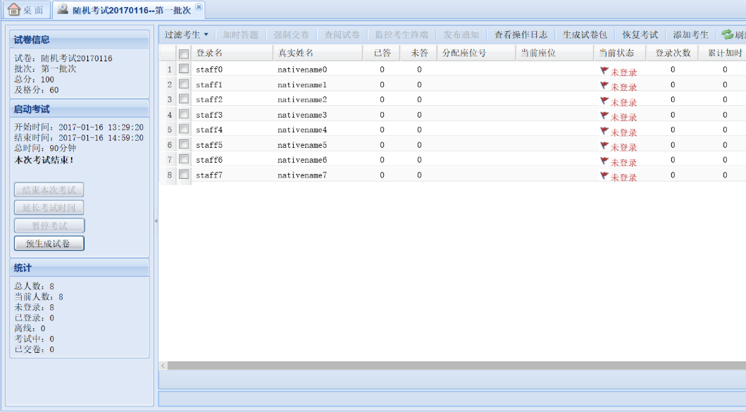 安排完考试后,当考试进行时可以实时的对本场考试的考生答题状态进行监控以及相关操作: