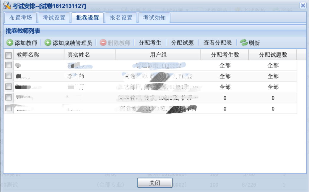 在考试安排界面,选择试卷,点击批卷设置,可以指定阅卷教师,指定各部门成绩查询专员。