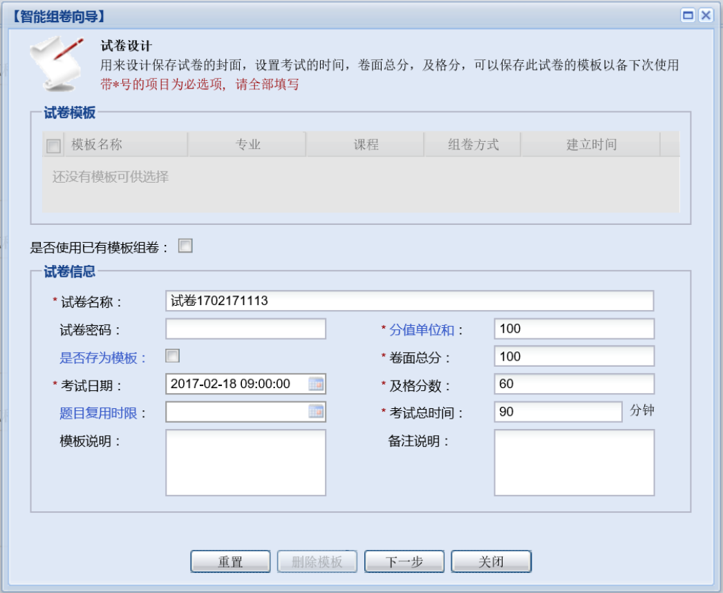 第一步:设置试卷相关属性,比如试卷名称,卷面总分,及格分等