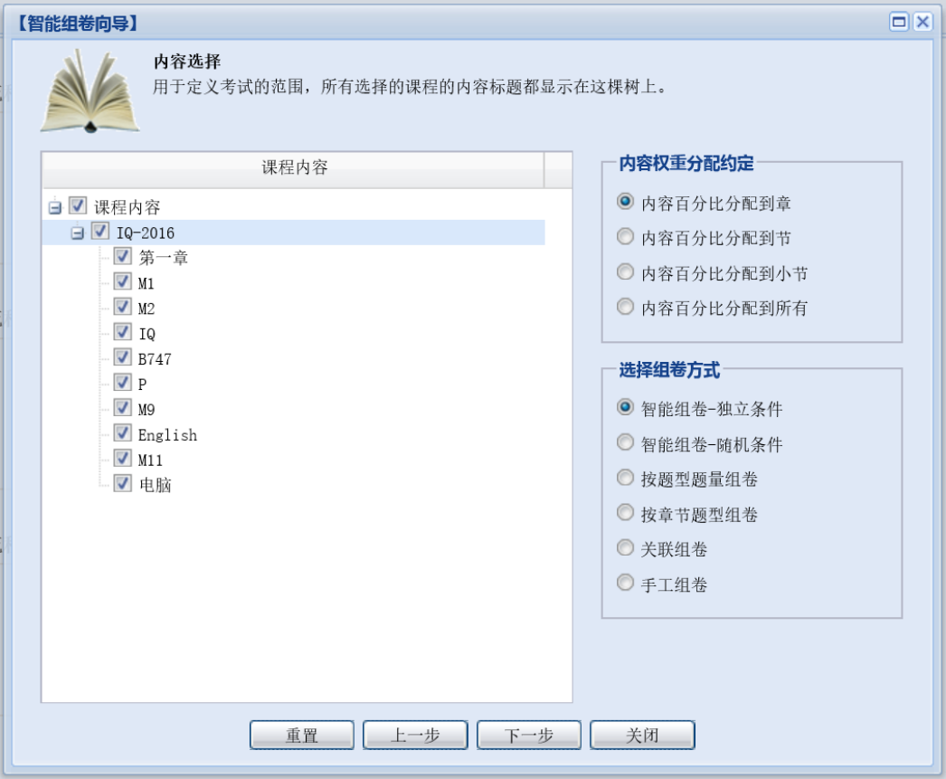 第三步:选择章节范围,进一步限定出题范围,四种内容权重分配,提供给使用者更加精细的操作空间,六种组卷方式,能够满足绝大多数客户的组卷要求。: