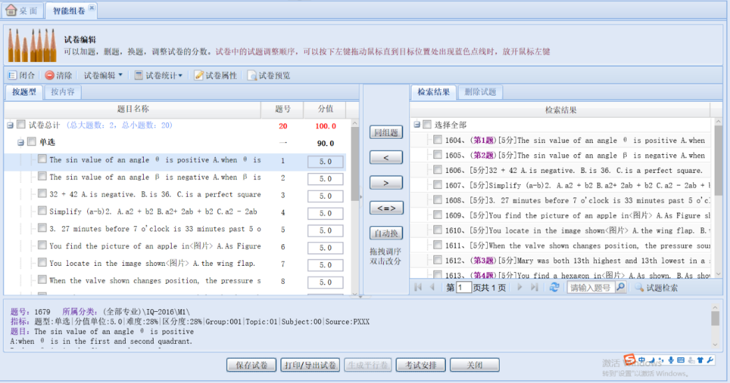最后一步:生成试卷,在本页的左边为试卷内容区,可以对试题进行删除,添加,替换等操作,右侧为题库搜索区,提供较为精确的搜索方式,最快的速度找到自己想要的题,然后选中试题点击按钮将试题添加到左侧试卷内容区域中,调整满意后保存试卷。